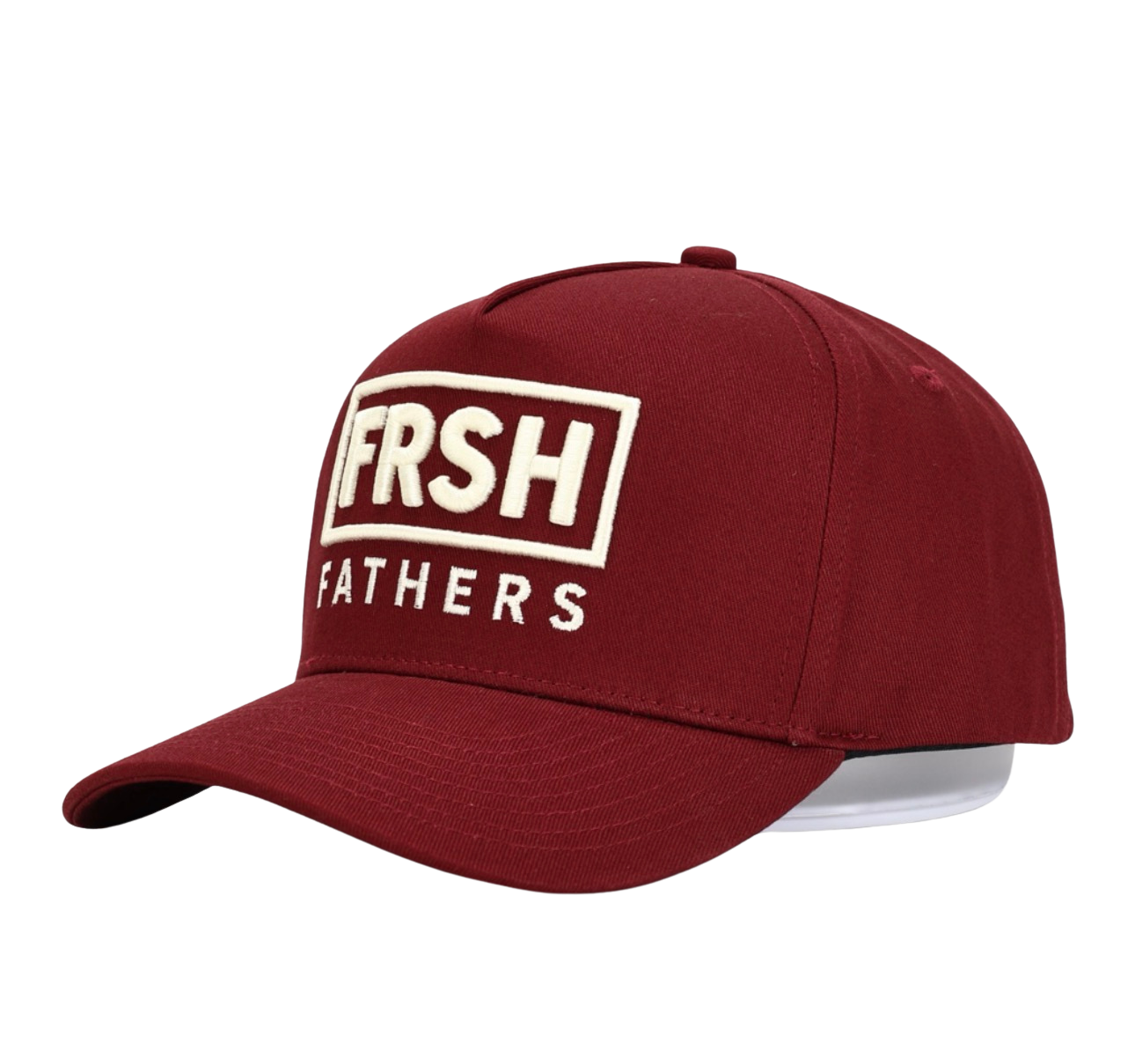 - Signature Embroidery – Raised 3D FRSH with flat FATHERS in almond, LEGACY on the right side, and BUILT TO LEAD above the rear arch.